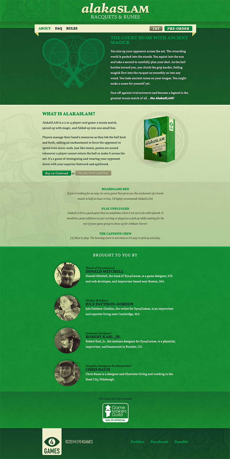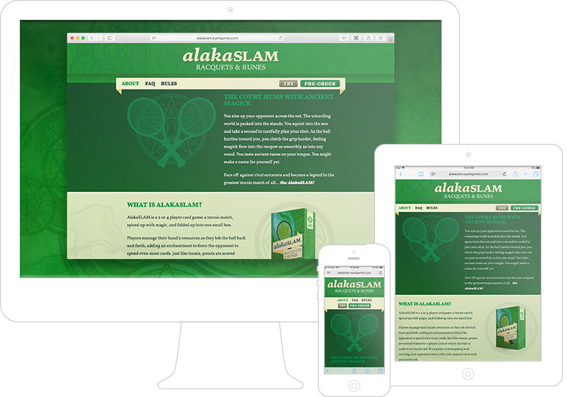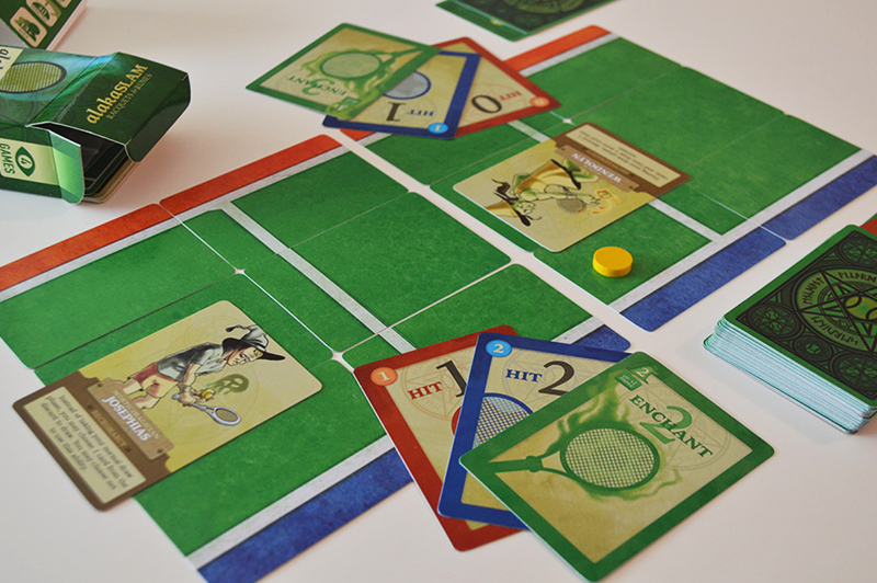 AlakaSLAM was the second game created, although the first published commercially for Eye4Games. A 2–4 player hand-management game about magickal tennis, in which I handled illustration, packaging, and graphic design. It has received the Game Makers Guild Seal of Approval.